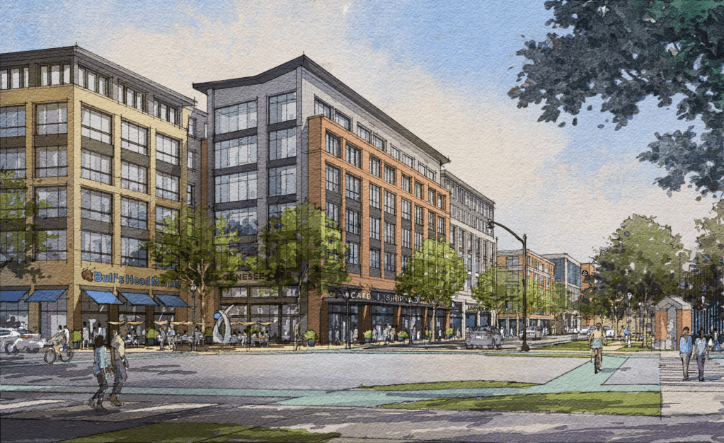 Initial plans for redeveloping the old Bull’s Head Plaza and other nearby properties envision a dense urban village with nearly 800 apartments.