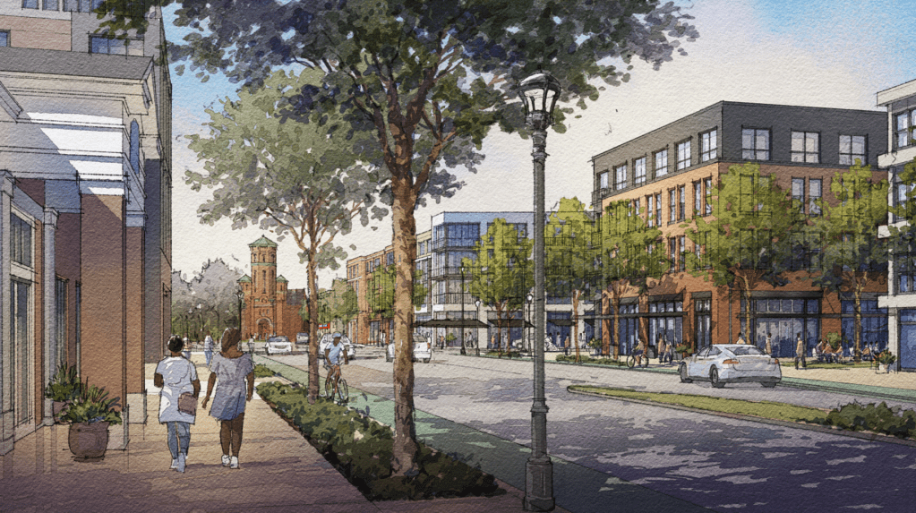 A rendering of West Main Street looking west toward the Chili and West avenues split and St. Mary’s campus shows buildings along either side rising four and five stories.